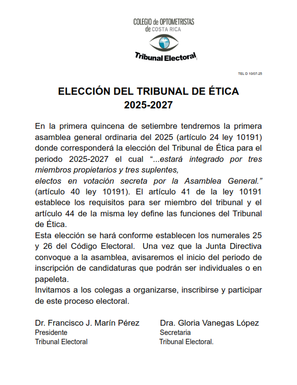 El Tribunal Electoral es el órgano responsable de velar por la transparencia, legalidad y legitimidad de los procesos electorales dentro del Colegio de Optometristas de Costa Rica. Este tribunal, elegido democráticamente en Asamblea General, se encarga de organizar, supervisar y garantizar el correcto desarrollo de las elecciones internas, asegurando la participación equitativa de todos los agremiados y el cumplimiento de las normas establecidas en los estatutos del Colegio.